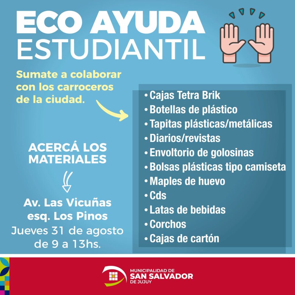 En el marco de la Fiesta Nacional de los Estudiantes 2023, la Coordinación de Políticas Públicas de Adolescencia y Juventud inició una campaña denominada “Eco Ayuda Estudiantil” donde se invita a todos los vecinos y vecinas a colaborar con elementos reciclables para los carroceros de la ciudad.