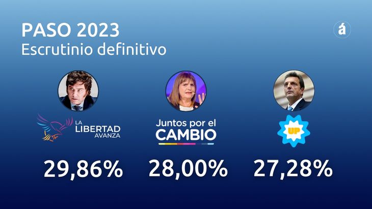 En el escrutinio provisorio, es decir, los números publicados el mismo día de las elecciones primarias (13 de agosto), La Libertad Avanza obtenía un 30,04%, escoltada por Juntos por el Cambio (28,27%) y Unión por la Patria (27,27%).