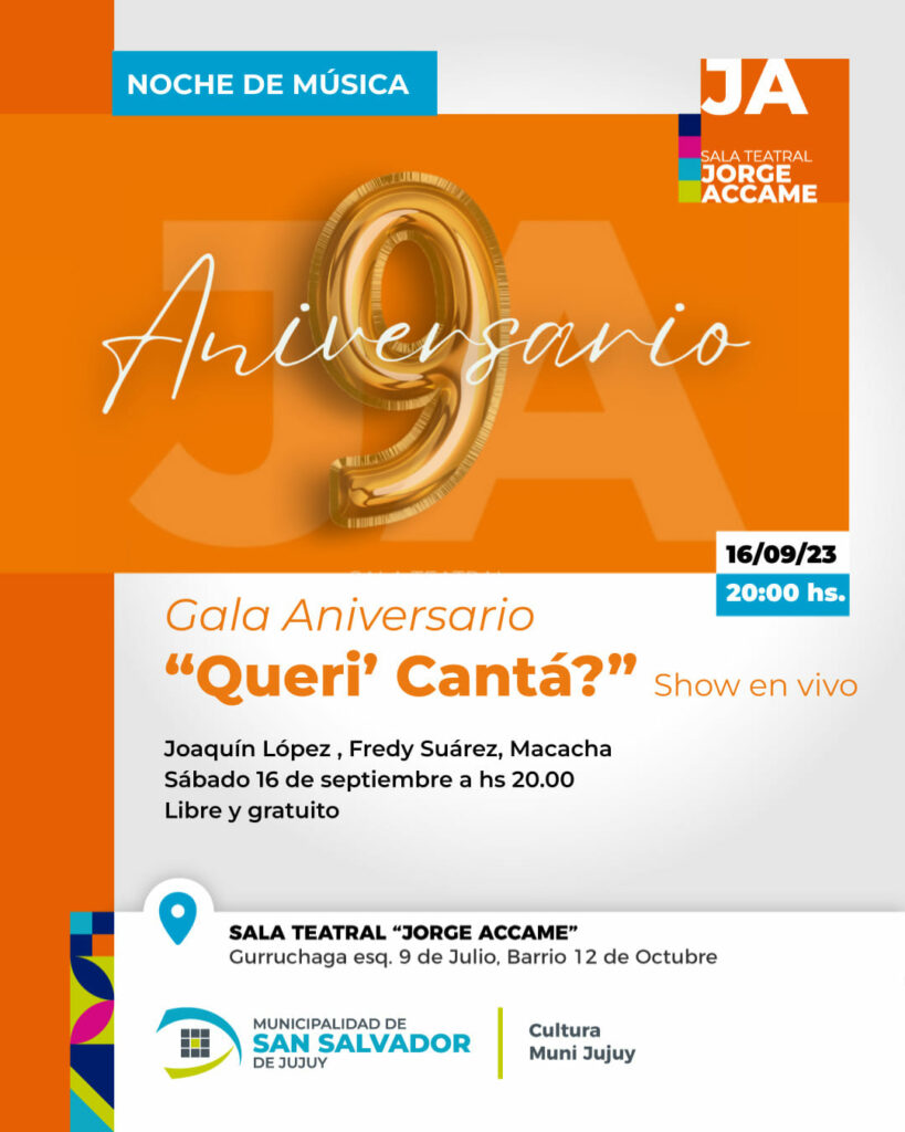 El sábado 16 de septiembre a partir de las 20 hs. se realizará el cierre de los festejos por el noveno aniversario de la apertura del espacio cultural del municip que funciona en el mercado 12 de Octubre. En la oportunidad se presentarán artistas jujeños como Joaquín López, Fredy Suarez, Macacha entre otros. La entrada es libre y gratuita.