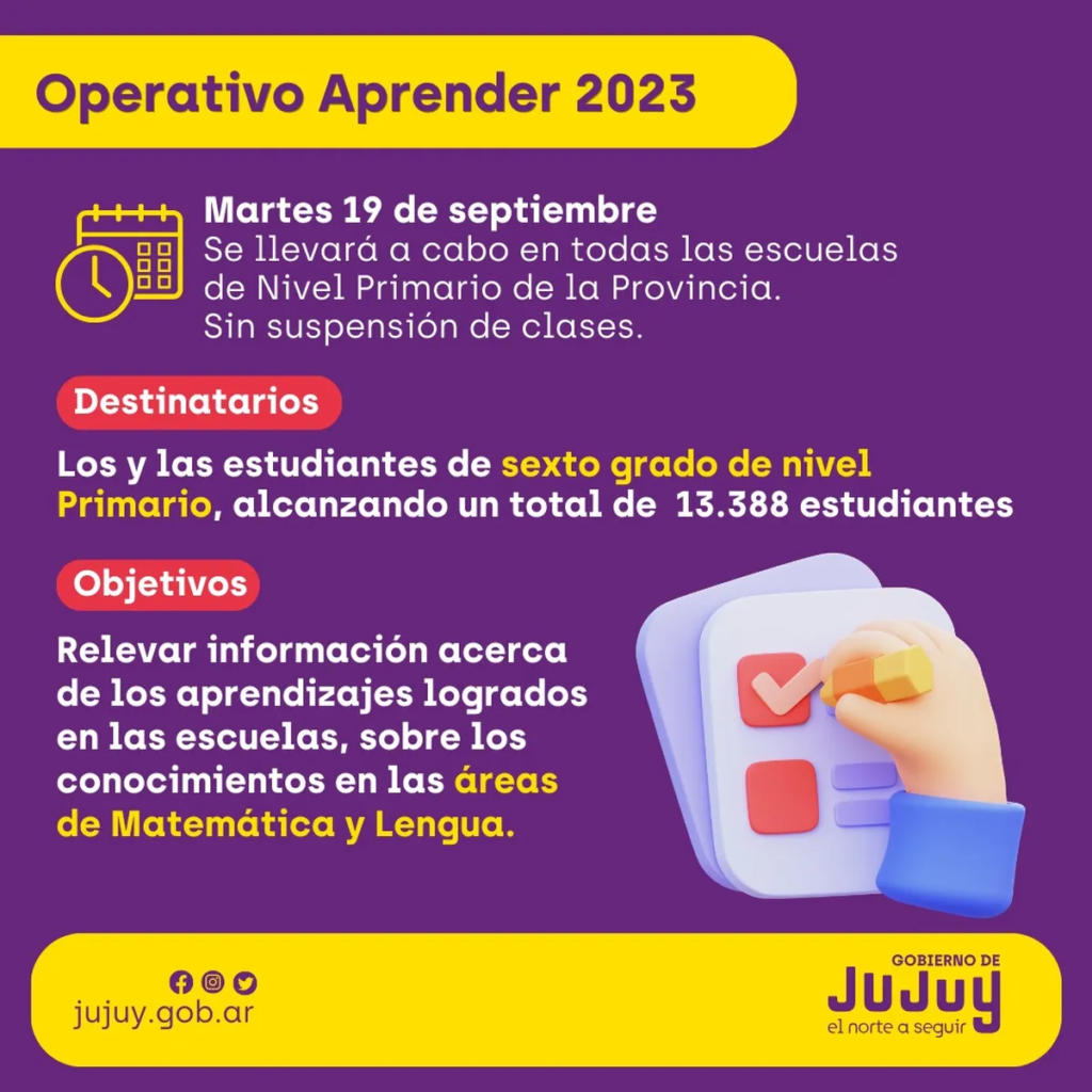 El Ministerio de Educación informa que el día martes 19 de septiembre, los y las estudiantes de sexto grado de nivel Primario de todas las escuelas de la Provincia, realizarán el operativo Aprender 2023, sin suspensión de clases. El objetivo del mismo es relevar información acerca de los aprendizajes logrados en las escuelas, sobre los conocimientos en las áreas de Matemática y Lengua.