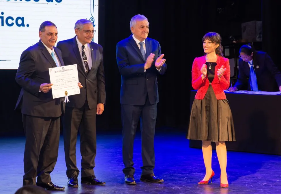 El gobernador de la Provincia, Gerardo Morales, participó del acto de colación de la primera corte del IUPS en el teatro Mitre de la capital jujeña junto a funcionarios provinciales y la comunidad de fuerza de seguridad.