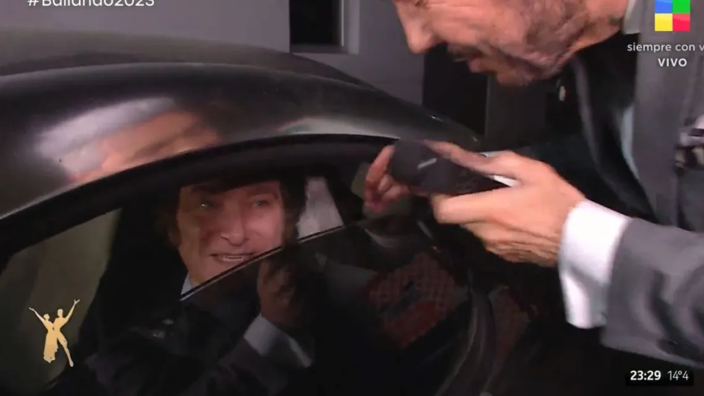 En la playa de estacionamiento del estudio, junto a una ambulancia, se encontraba un vehículo deportivo, de color oscuro, donde Marcelo Tinello reconoció a Javier Milei, sentado detrás del volante “Perdón, buenas noches, ¿puede bajar el vidrio?, ¿es el candidato presidencial? ¿Puedo abrir la puerta? preguntó el conductor del «Bailando 2023», mientras intentaba colocar el micrófono por el espacio que estaba abierto por la ventanilla.