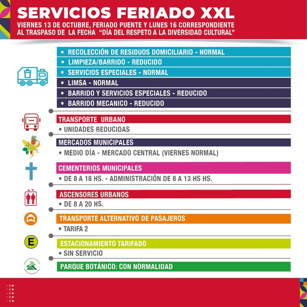 La Municipalidad de San Salvador de Jujuy informó a toda la comunidad como funcionarán los servicios con motivo de los feriados del día viernes 13 de octubre, Feriado Puente y el Feriado Nacional del día lunes 16 correspondiente al traspaso de la fecha en la que se celebra el “Día del Respeto a la Diversidad Cultural”