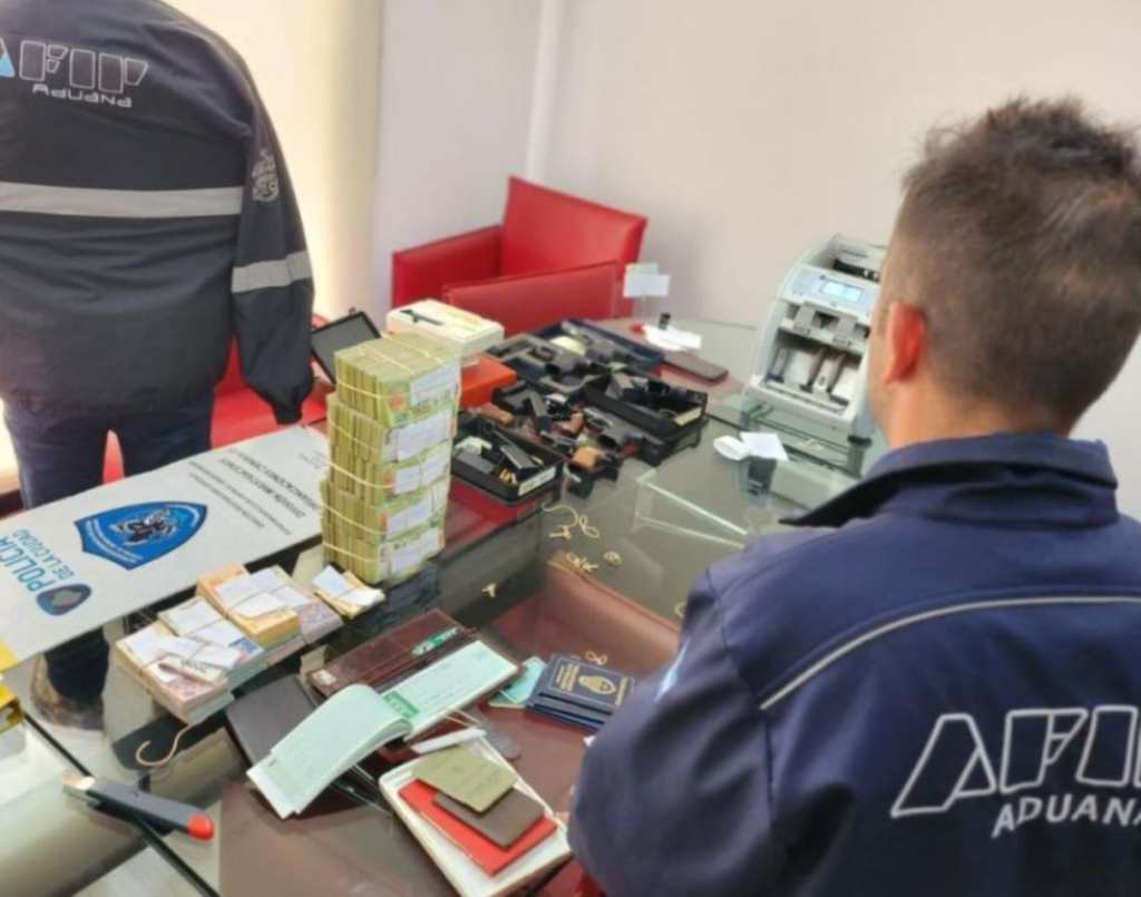 Serían al menos siete las armas de fuego que secuestraron los efectivos de la AFIP y de la Aduana: cinco pistolas y dos revólveres. Los fajos de dinero que encontraron estaban agrupados en billetes de $200, de $500 y de $1000, se informó.