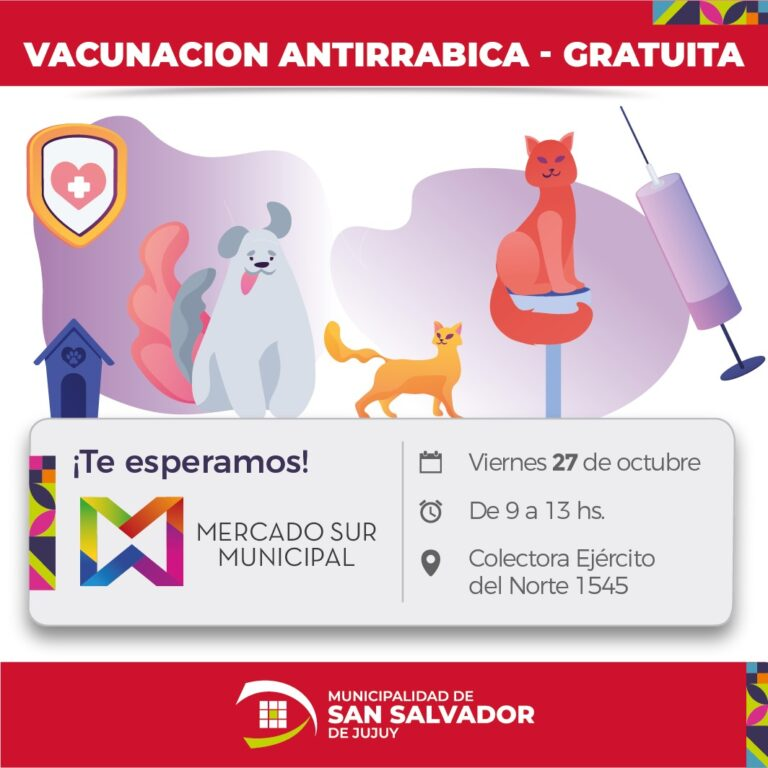 Los propietarios de perros y gatos de Mariano Moreno, Alto Gorriti, Cuyaya y zonas cercanas pueden acercarse con sus mascotas al Mercado Sur Municipal el viernes 27 de octubre para recibir la vacuna antirrábica de forma gratuita. Es importante recordar que la rabia es una enfermedad prevenible, y la vacunación de animales es un paso crucial para proteger la salud pública y la salud de nuestras mascotas.