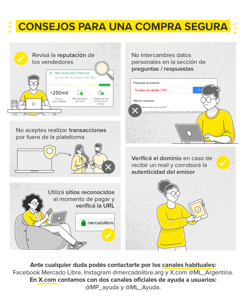 - Contactarse a través de canales oficiales. Mercado Libre también hace hincapié en que los usuarios se contacten exclusivamente por los canales oficiales. Los contactos a través de redes sociales se realizan de parte de los perfiles verificados (tilde junto a la cuenta) de la compañía. Mercado Libre tiene cuentas oficiales en Facebook, Instagram y X (Twitter). De hecho, en esta última plataforma cuenta con dos canales oficiales de ayuda a usuarios: @MP_ayuda y @ML_Ayuda.