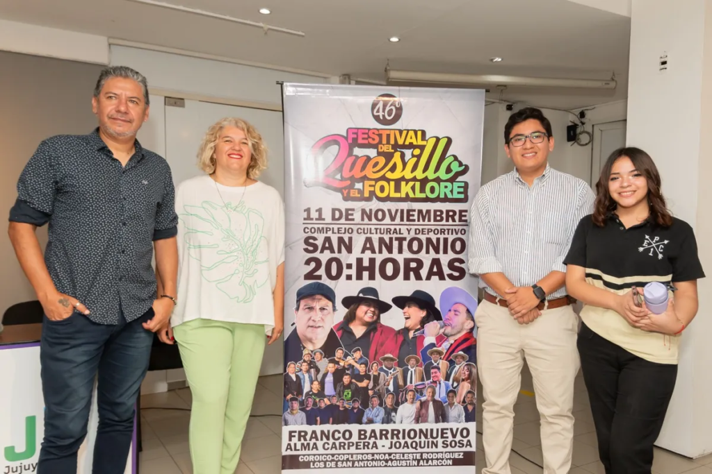 La directora provincial de Cultura, Gisela Arias junto al director de Turismo de la Municipalidad de San Antonio, Matías Díaz, acompañados por los artistas Celeste Rodríguez, y Mauricio Rivero de Copleros, presentaron el 46° Festival del Quesillo y el Folklore, que tendrá lugar el próximo sábado a las 20 horas en el complejo cultural y deportivo de San Antonio. Durante la nueva edición se podrá disfrutar de una grilla de artistas muy importante como así también patio de comida.