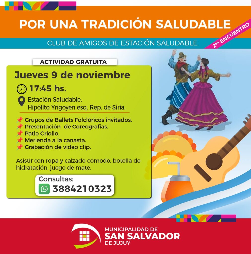 La Municipalidad de San Salvador de Jujuy, a través de la Secretaría de Desarrollo Humano, invitó a los vecinos y vecinas a participar del segundo encuentro “Tradiciones Saludables” que se llevará a cabo el próximo jueves 9 de noviembre a las 17.45 horas en las instalaciones de la Estación Saludable ubicada en Hipólito Yrigoyen esquina República de Siria.