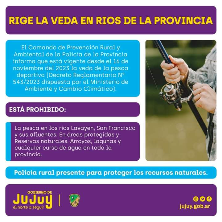 Según indica la resolución N°543 aprobada por la Secretaría de Biodiversidad y Desarrollo Sustentable dependiente del Ministerio de Ambiente y Cambio Climático de la Provincia, establece la veda de pesca con fines deportivos y recreativos para la temporada 2023 – 2024 para garantizar el intercambio generacional de dichas poblaciones de peces. Por tal motivo, la veda rige en los ríos San Francisco, Lavayen y sus afluentes.