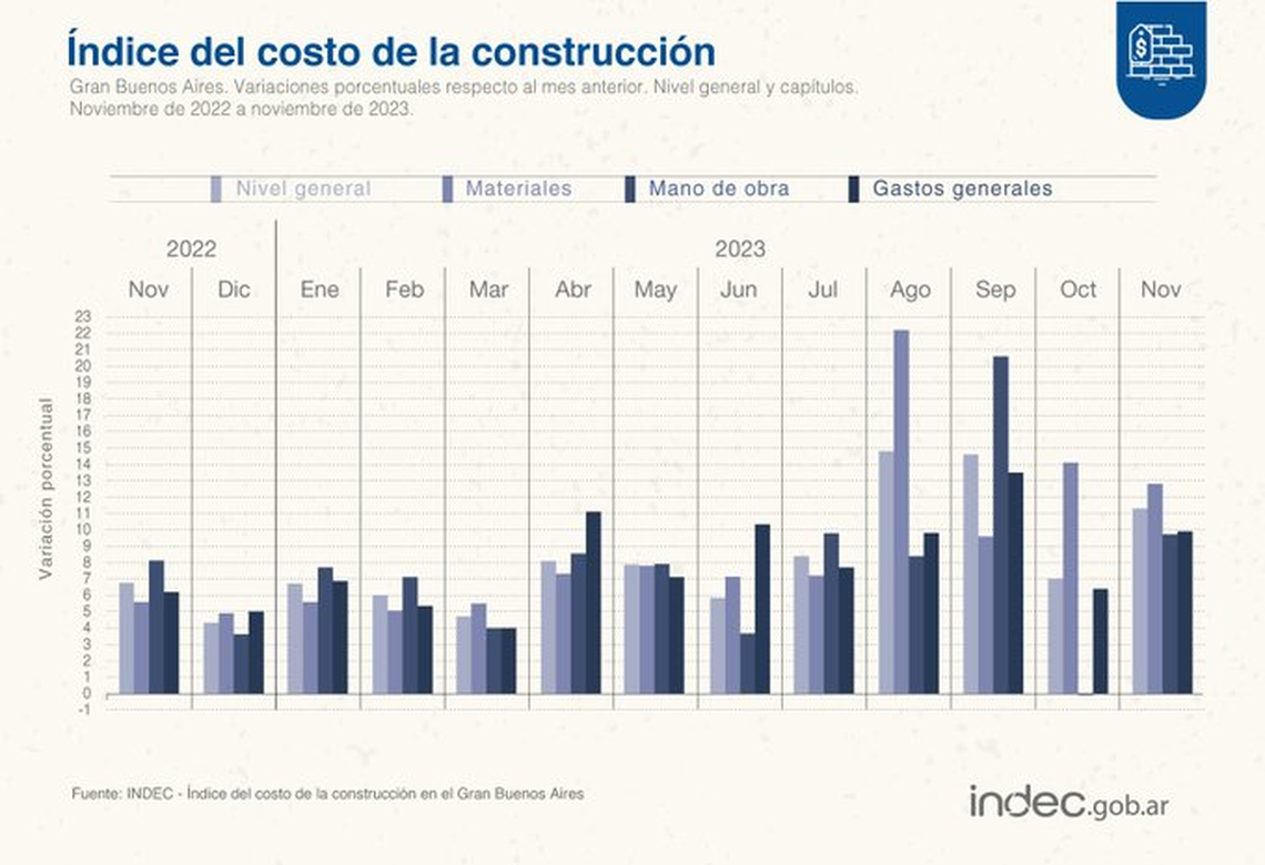 El nivel general del Índice del costo de la construcción (ICC) en el Gran Buenos Aires correspondiente a noviembre de 2023 registra una suba de 11,3% respecto al mes anterior.
