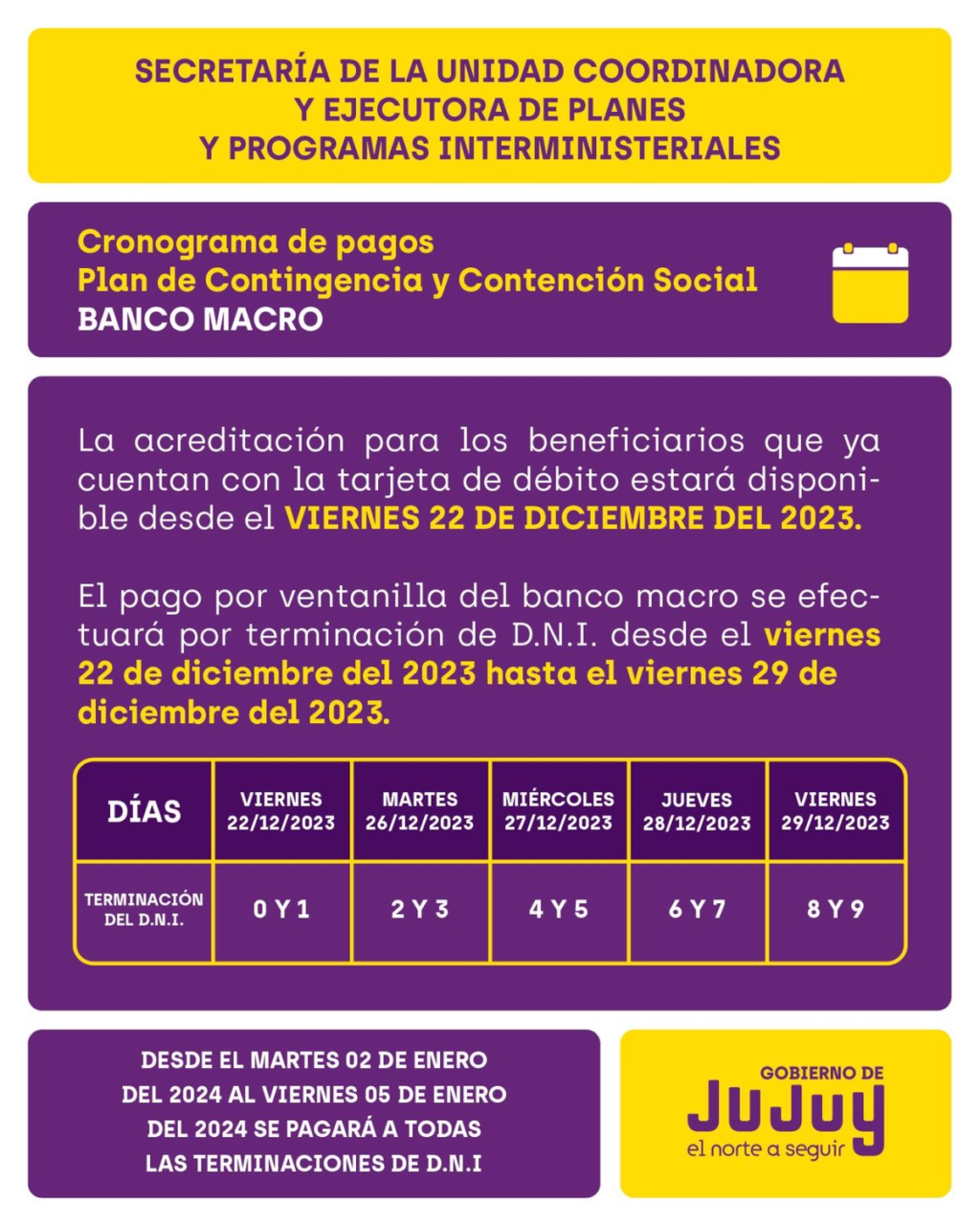 El Gobierno de la Provincia, a través de la Secretaría de la Unidad Coordinadora y Ejecutora de Planes y Programas Interministeriales, informa que la acreditación a beneficiarios que ya cuentan con tarjeta de débito del Banco Macro, estará disponible desde el viernes 22 de diciembre de 2023.