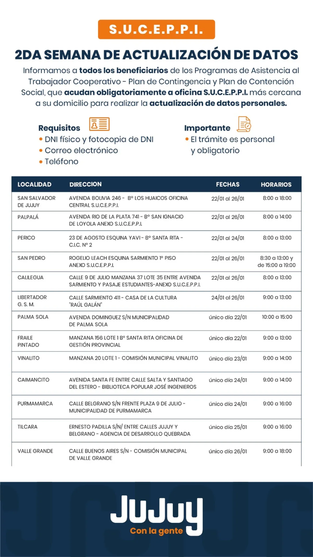 La Secretaría de Unidad Coordinadora y Ejecutora de Planes y Programas Interministeriales (SUCEPPI) informa a todos los beneficiarios del Programa de Asistencia al Trabajador Cooperativo, Plan de Contingencia y Plan de Contención Social, que acudan obligatoriamente a oficinas de las SUCEPPI más cercana a su domicilio para realizar la actualización de datos personales.