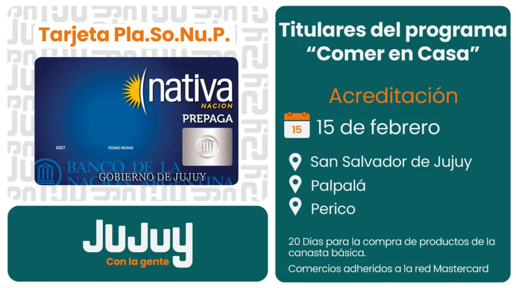 El Ministerio de Desarrollo Humano, a través de la Secretaría de Asistencia Directa y Calidad de Vida, anunció que a partir del día 15 de febrero se encontrarán acreditadas las Tarjetas PLASONUP correspondientes al mes de enero para quienes son titulares del Programa Comer en Casa en San Salvador de Jujuy, Palpalá y Perico.