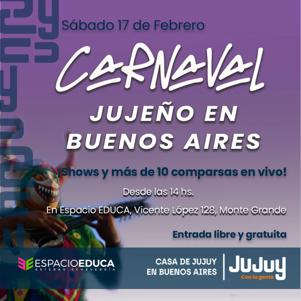 Como cada año, la Casa de Jujuy en Buenos Aires invita al público en general a participar de la tradicional festividad jujeña caracterizada por el color y la alegría. El “carnaval jujeño” se celebrará el sábado 17 de febrero, a partir de las 14 hs. en elEspacio EDUCA, Vicente López 128, Monte Grande, con entrada libre y gratuita.