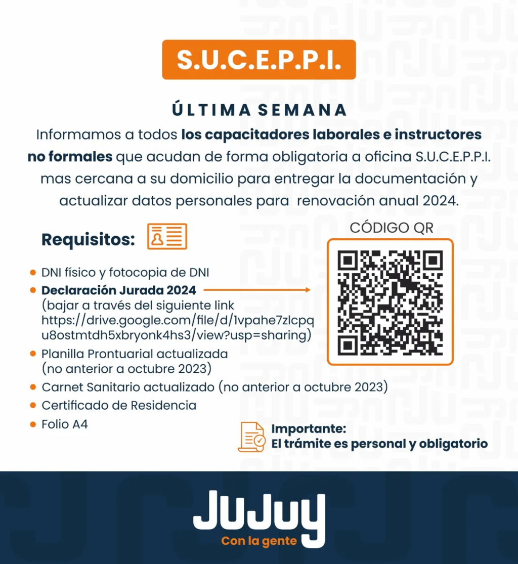 La Secretaría de Unidad Coordinadora y Ejecutora de Planes y Programas Interministeriales (SUCEPPI) informó a todos los capacitadores laborales e instructores no formales que acudan de forma obligatoria a oficina SUCEPPI más cercana a su domicilio para realizar la actualización de datos personales para renovación anual 2024.