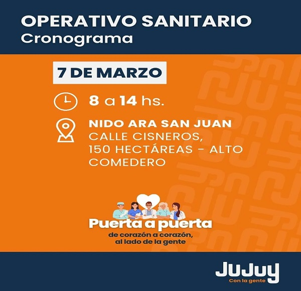 De acuerdo al cronograma establecido para el presente mes, mañana 07 de marzo el operativo sanitario se llevará a cabo en NIDO ARA San Juan ubicado en Calle Cisneros – 150 Hectáreas- Alto Comedero.