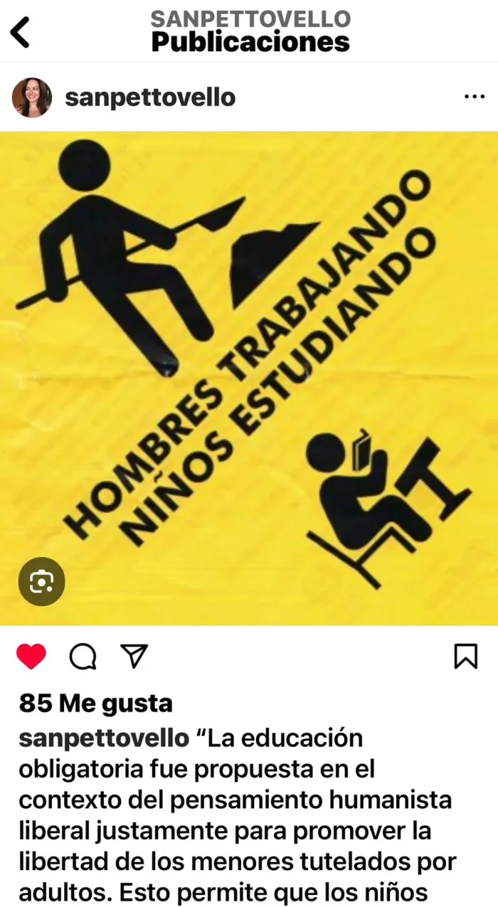 En un posteo en redes sociales, que ilustró con una imagen que dice «Hombres trabajando; niños estudiando», la funcionaria señaló: «La educación obligatoria fue propuesta en el contexto del pensamiento humanista liberal justamente para promover la libertad de los menores tutelados por adultos». Y siguió: «Esto permite que los niños puedan educarse, ampliando horizontes para desarrollar un proyecto de vida propio en el contexto de culturas cada vez más completas, lo que vuelve imprescindible una alfabetización integral».