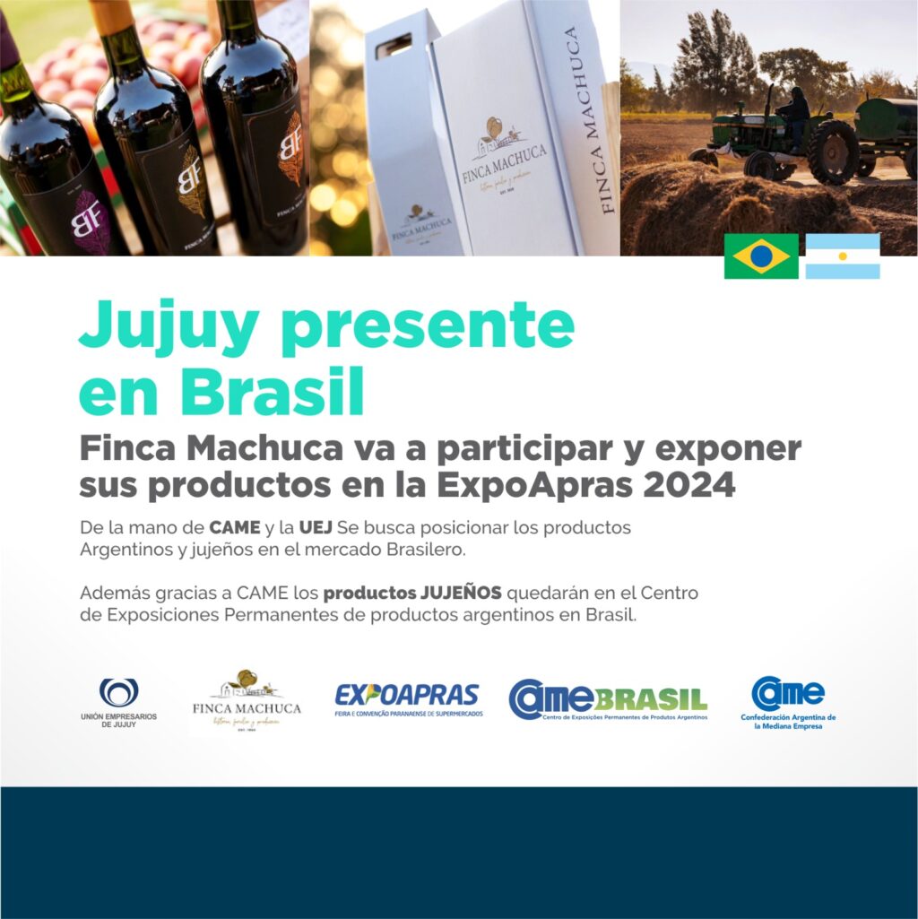 A través de una acción de promoción e internacionalización pyme de la Confederación Argentina de la Mediana Empresa (CAME) y la Unión Empresarios de Jujuy (UEJ), la Finca Machuca, una empresa familiar jujeña, participará y expondrá sus productos en la ExpoApras 2024, la feria supermercadista más grande del sur del Brasil, que se desarrollará en Curitiba, Paraná, del 16 al 18 de abril; y el Centro de Exposición Permanente de Brasil, una propuesta de CAME para que empresas argentinas puedan exhibir sus productos en el sur de Brasil, un mercado estimado en 11 millones de consumidores.
