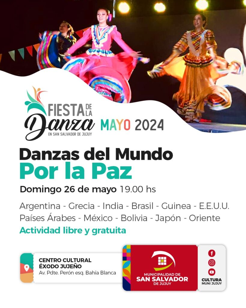 Este domingo llega e “Danzas del Mundo por la Paz”, un evento que promete ser una celebración vibrante de la diversidad cultural a través del arte del movimiento. Este evento forma parte de quinta edición la Fiesta de la Danza que la Municipalidad de San Salvador de Jujuy ha estado organizando a lo largo del mes de mayo. La entrada es libre y gratuita