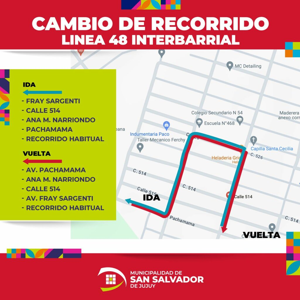 La Dirección General de Tránsito y Transporte dependiente de la Secretaria de Servicios Públicos de la Municipalidad de San Salvador de Jujuy, informó que a partir del día 28 de mayo la línea 48 Interbarrial modificará su recorrido.