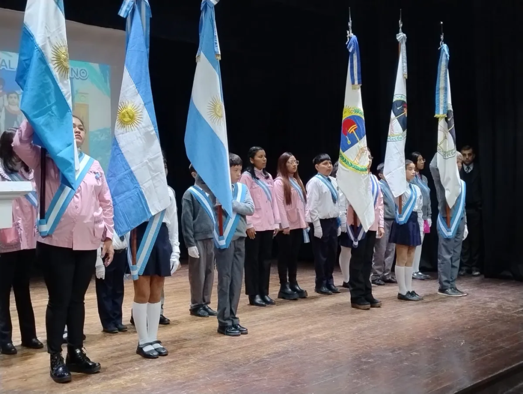En la parte protocolar del acto, abanderados de distintas escuelas acompañaron la entonación del Himno Nacional Argentino, que también fue interpretado en lengua de señas por parte de un docente de educación especial.
