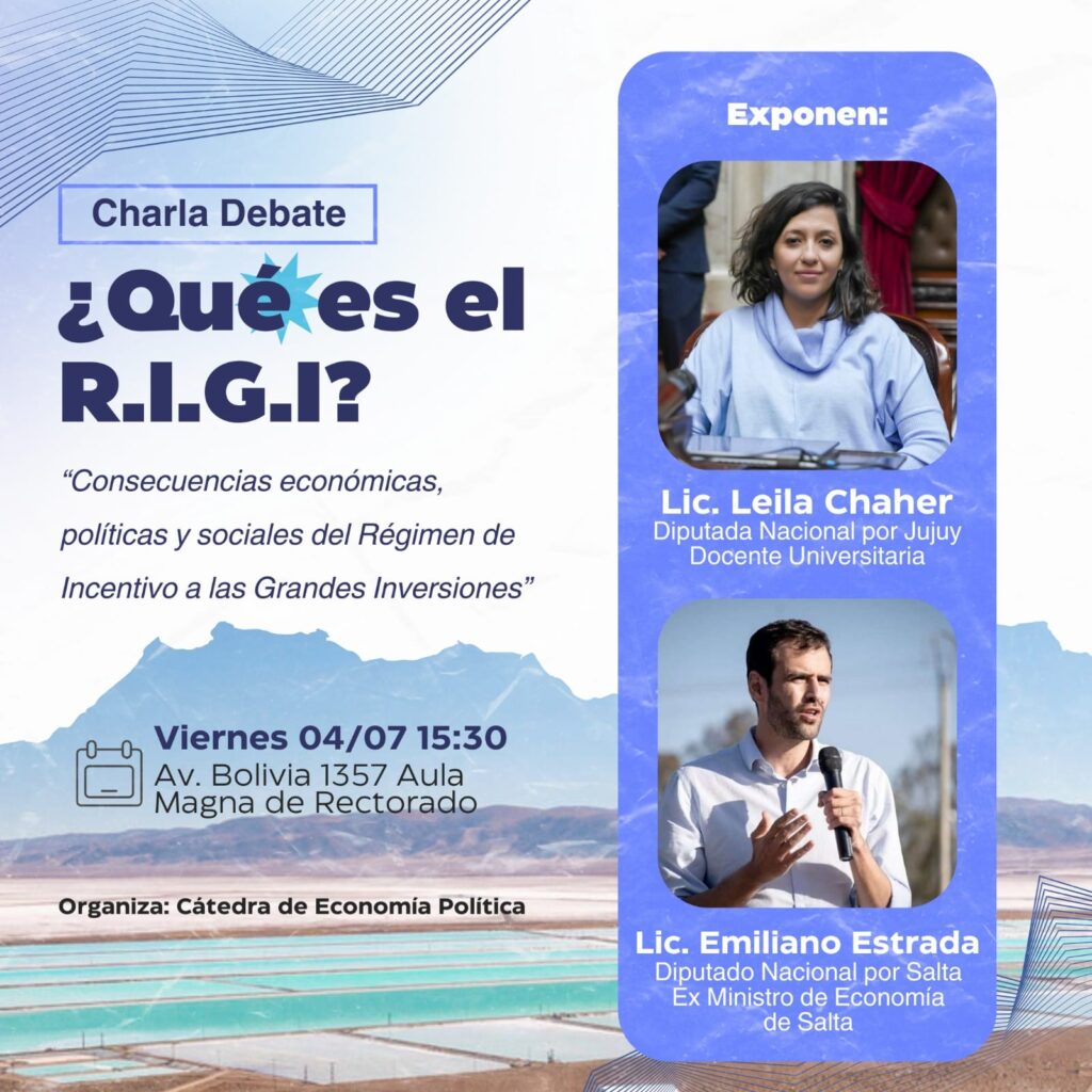 Con entrada libre y gratuita, la charla ¿Qué es el RIGI? Consecuencias Económicas, Políticas y Sociales del Régimen de Incentivo Para Grandes Inversiones, otorga un espacio de debate, conocimiento y difusión sobre esta legislación que perjudica al NOA y toda la Argentina.