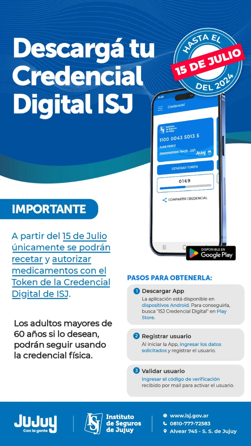 El Instituto de Seguros de Jujuy informa que a partir de este 15 de julio, y a través de la Credencial Digital, desarrollará la posibilidad de que cada afiliado tanto activo como del sector pasivo pueda contar con la receta digital y la autorización del profesional médico.