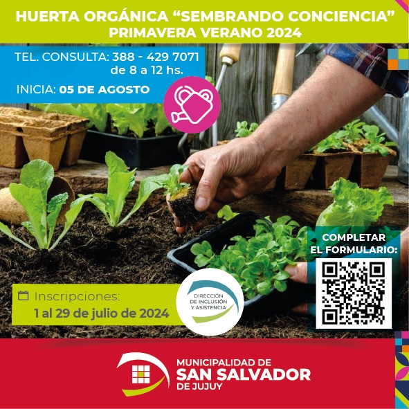 Se recordó a los interesados que las inscripciones a los talleres de huerta están abiertas y se extenderán hasta el 29 de julio, en el horario de 8 a 13 horas. Para el trámite deberán completar el formulario on line y seguir las instrucciones. Para mayor información, pueden comunicarse al 388 – 4297071 o en la Dirección de Inclusión y Asistencia del municipio capitalino, cita en Avenida Almirante Brown y Oscar Orias barrio San Pedrito