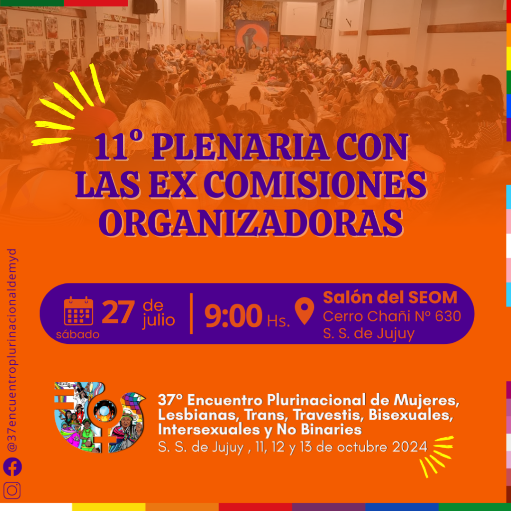 San Salvador de Jujuy, 25 de julio de 2024. La Comisión Organizadora del 37° Encuentro Plurinacional de Mujeres, Lesbianas, Trans, Travestis, Bisexuales e Identidades No Binaries invita a las mujeres y disidencias que quieran sumarse la organización del Encuentro a participar de la reunión plenaria de este sábado 27 de julio en la que, por esta ocasión, recibirá a integrantes de ex comisiones organizadoras de otras provincias.