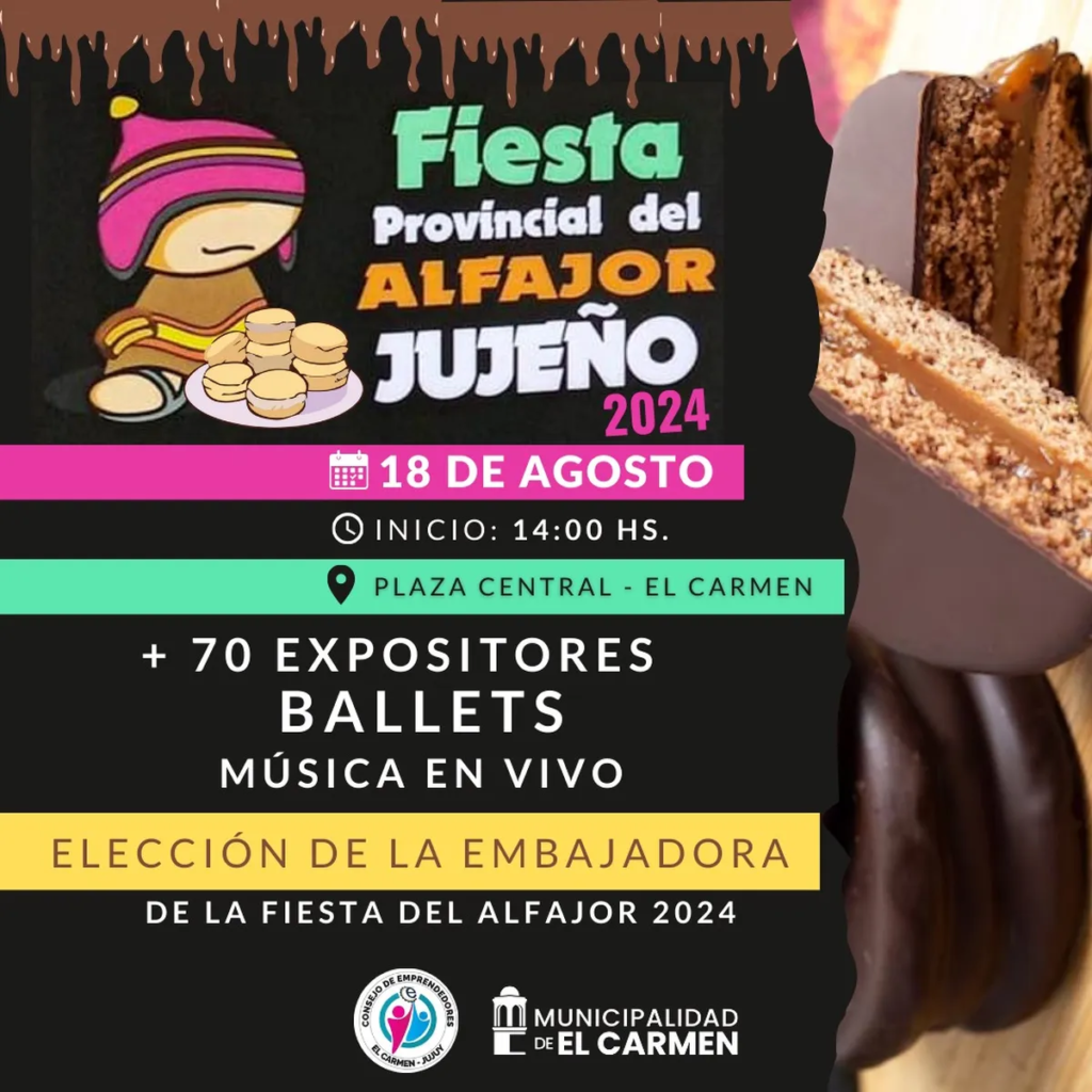La Municipalidad de El Carmen junto al Consejo de Emprendedores invitan a participar del Festival Provincial del Alfajor, donde en esta edición se podrá disfrutar de un patio gastronómico, paseo de artesanos y música en vivo.