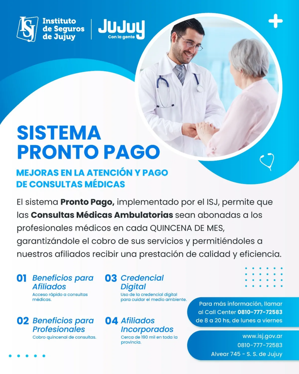 El Instituto de Seguros de Jujuy recuerda a la ciudadanía que se encuentra vigente el Sistema de Pronto Pago, para las consultas médicas ambulatorias y autorizadas por el ISJ, lo cual constituye a una herramienta de mejora para la atención al afiliado.