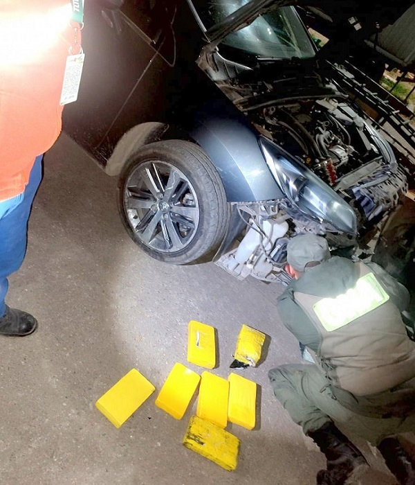 Mediante el uso de herramientas, se retiraron ambos paragolpes, en donde los gendarmes pudieron visualizar una especie de doble fondo donde estaban alojados un total de 22 ladrillos envueltos en cinta de color amarilla.