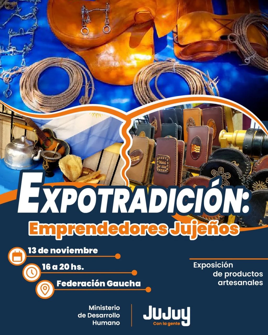 El Ministerio de Desarrollo Humano, a través de la Secretaría de Desarrollo Integral y la Coordinación de Economía Comunitaria, llevará a cabo la ExpoTradición de Emprendedores Jujeños este miércoles 13 de noviembre, de 16 a 20 horas, en sede de la Federación Gaucha Jujeña, ubicada en la capital jujeña.