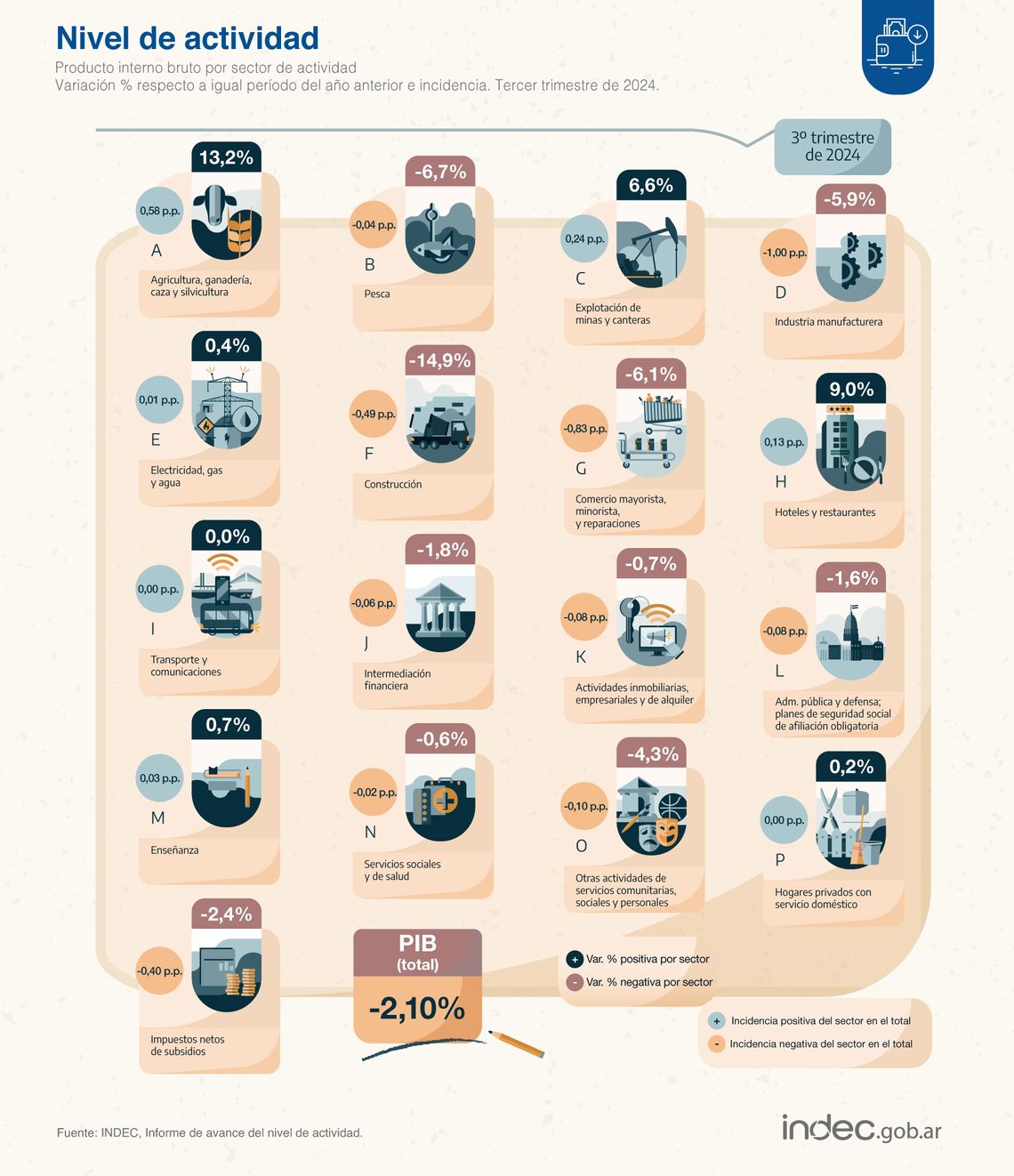 a mayor incidencia negativa (-1 punto porcentual) en la caída interanual del PBI; y Agricultura, ganadería, caza y silvicultura aportó la mayor tracción positiva (0,58 p.p.), al crecer 13,2%.