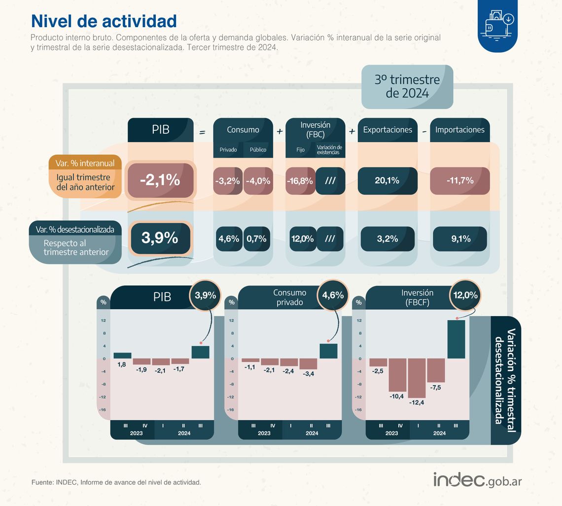 El Producto Bruto Interno (PBI) presentó un crecimiento del 3,9% en términos desestacionalizados durante el tercer trimestre de 2024, respecto al trimestre anterior. Así lo señaló un relevamiento del Instituto de Estadísticos y Censos (INDEC), tras destacar también una caída interanual del 2,1% y una contracción del 3% en el acumulado del año.