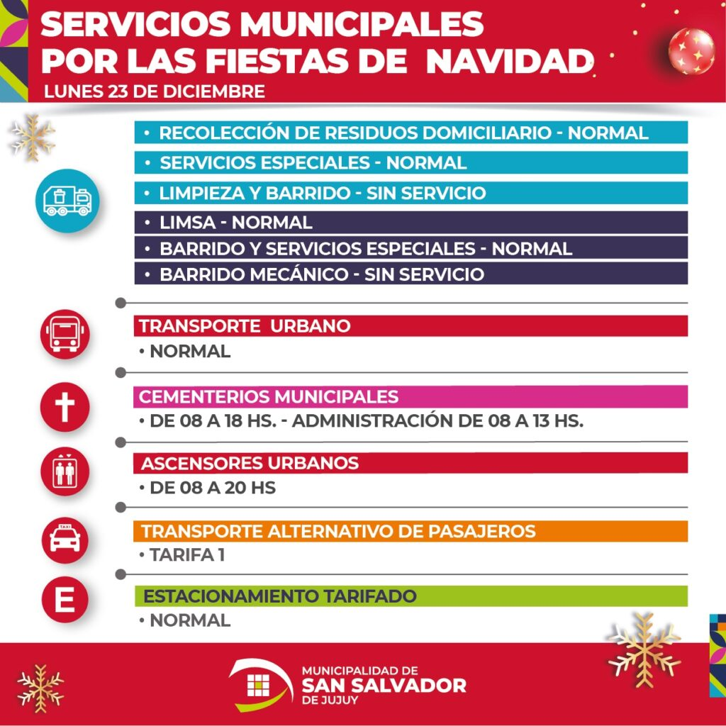 Desde la Secretaría de Servicios Públicas de la Municipalidad de San Salvador de Jujuy, informaron la modalidad de prestación de servicios municipales para los días lunes 23, martes 24 y domingo 25 de diciembre.