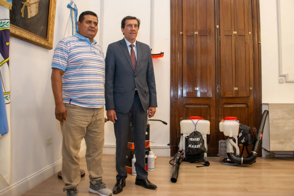 La entrega, de mochilas fumigadoras y desmalezadoras, se hizo en el marco del programa de reforzamiento de equipamiento para fortalecer los operativos de lucha contra la proliferación del mosquito del dengue, teniendo en cuenta la temporada de calor y lluvia que hay en esta temporada.