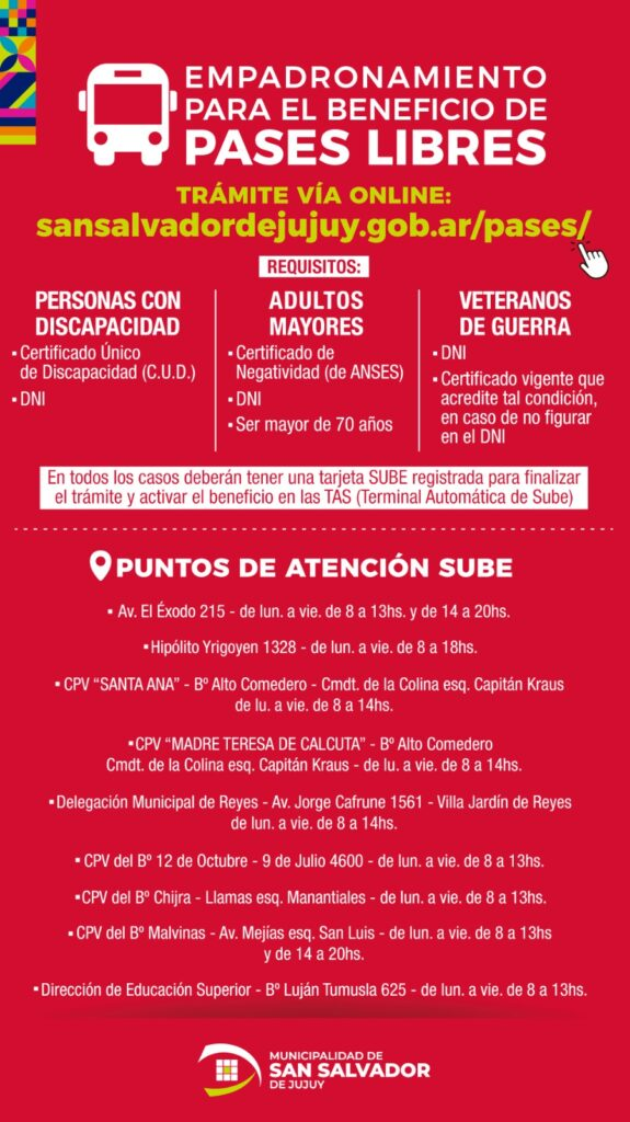 La Municipalidad de San Salvador de Jujuy informó que a partir del día lunes 10 de febrero de 2025, se abrirán las inscripciones para el reempadronamiento de los beneficiarios del Pase Libre, destinado a veteranos de guerra, adultos mayores y personas con discapacidad, que utilizan el transporte público.