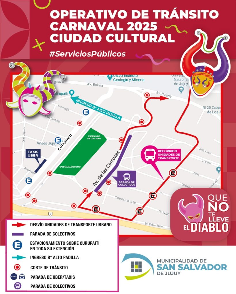 La Secretaría de Servicios Públicos de la Municipalidad de San Salvador de Jujuy, informa a la población en general y, especialmente, a los conductores, sobre las disposiciones tomadas en virtud de la celebración del Carnavalódromo y el Carnaval de los Tekis, que tendrán lugar en Ciudad Cultural los días viernes 28 de febrero; sábado 1, domingo 2 y lunes 3 de marzo.