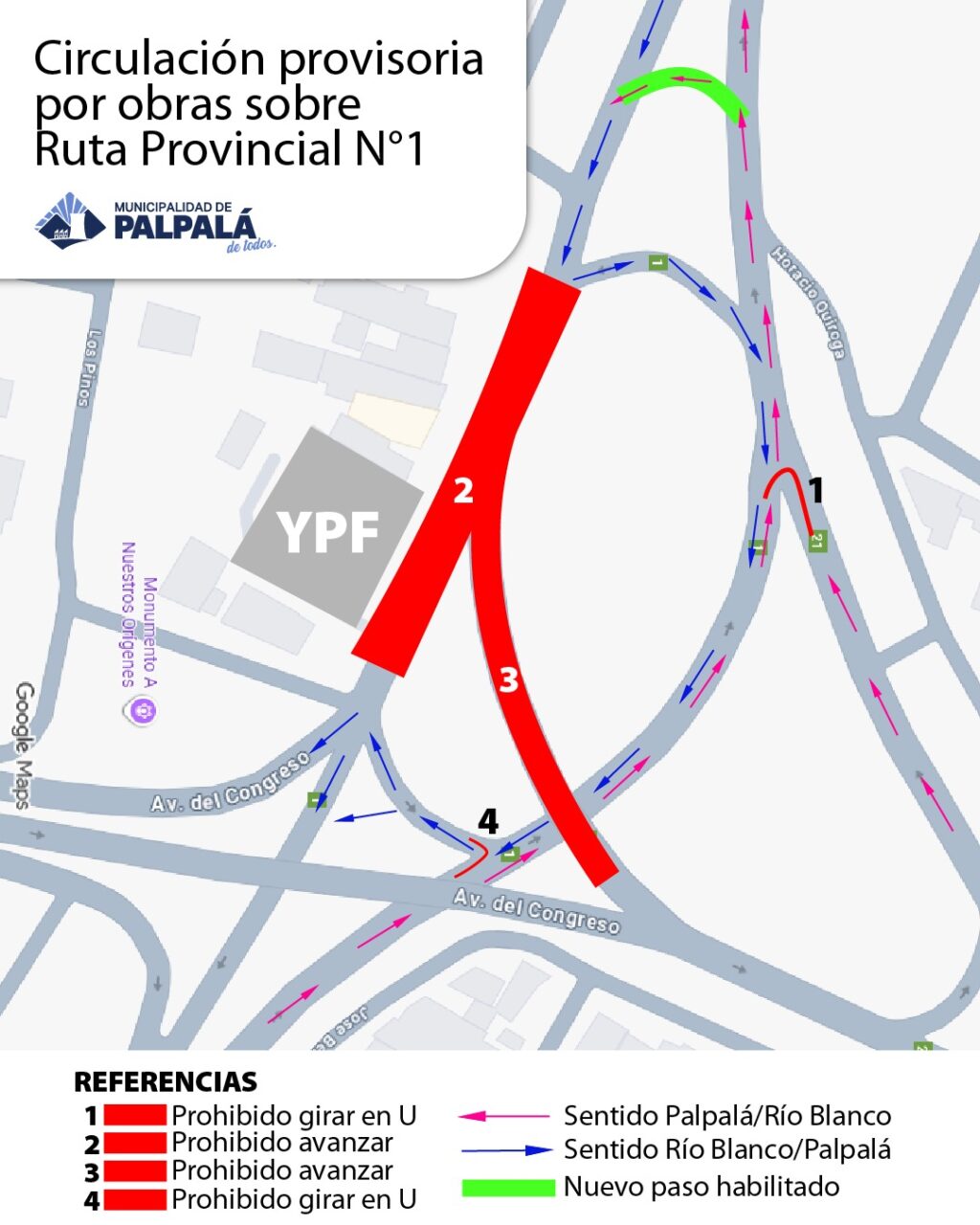 La Municipalidad de Palpalá informa que en virtud de los plazos establecidos para el fraguado del pavimento de hormigón H21 y la liberación al tránsito en el acceso norte a la ciudad, los conductores de diferentes vehículos que ingresen o egresen de la ciudad, deberán realizarlo con precaución. Por ese motivo se habilitó temporariamente un cambio provisorio con la señalización dispuesta por un lapso de aproximadamente 20 días.