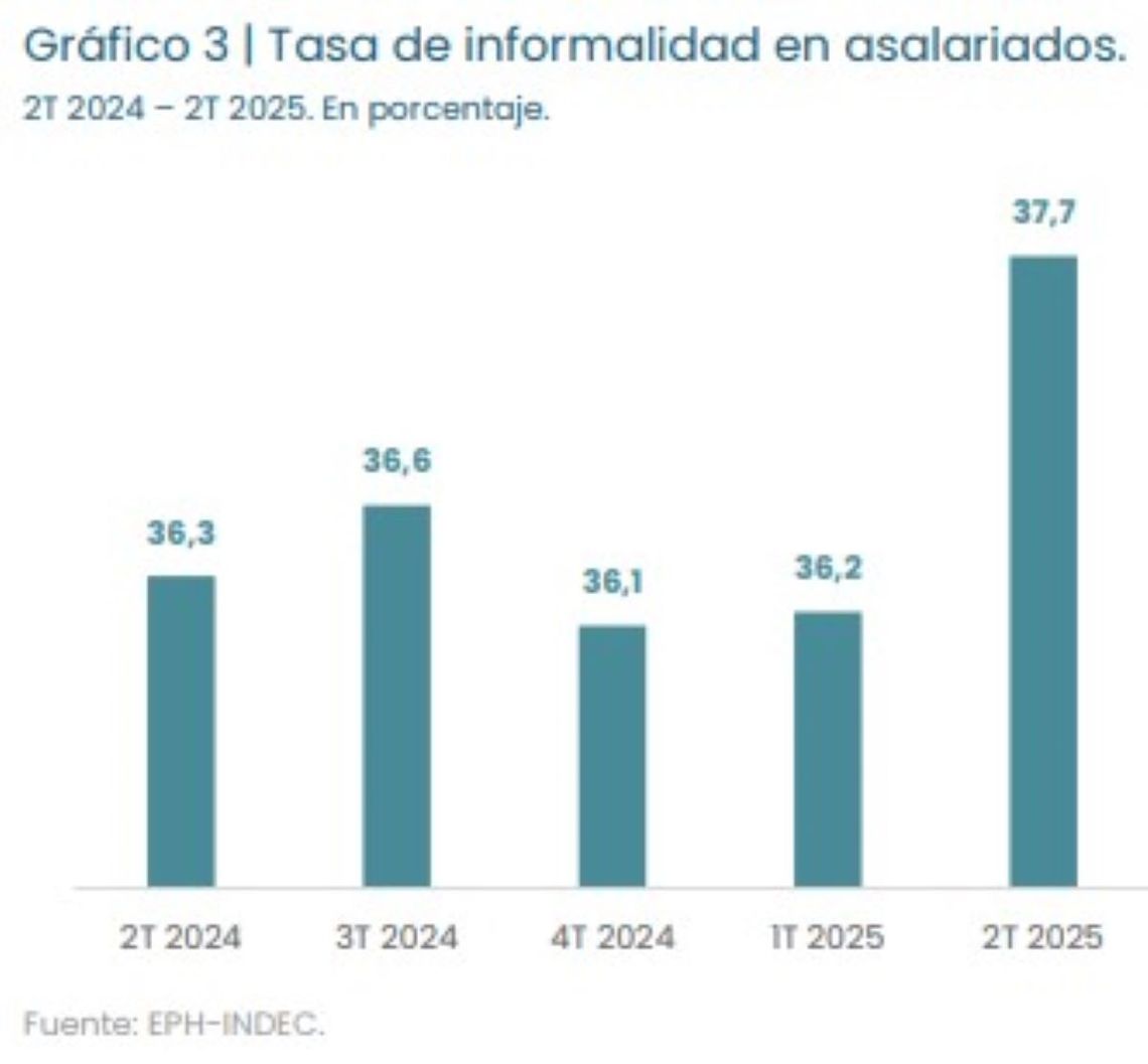 El informe reveló un dato especialmente preocupante para el sector asalariado. La informalidad en este grupo alcanzó el 37,7%, el valor más alto registrado desde el año 2008, con la excepción del segundo trimestre de 2022.