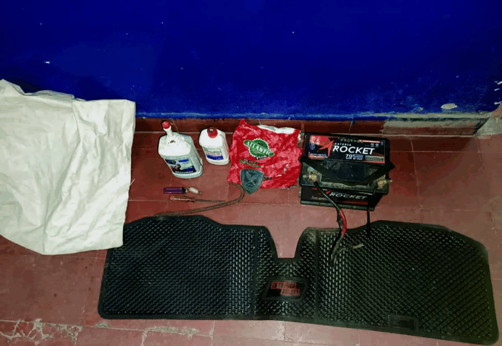 Los uniformados encontraron que los individuos llevaban una batería de 70AMP, una alfombra con la inscripción FIAT 147, herramientas, envases de aceite, líquido de frenos y un tubo metálico adaptado como pipa.
