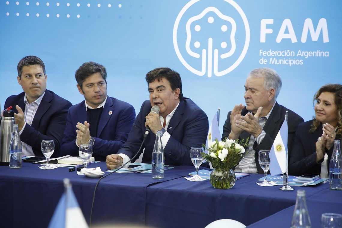 El presidente de la Federación Argentina de Municipios (FAM), Fernando Espinoza, y el gobernador de la provincia de Buenos Aires, Axel Kicillof, encabezaron este jueves la Asamblea de la FAM, junto a intendentes de todo el país, durante se evaluaron propuestas para exigir un cambio de rumbo económico y social para el país.