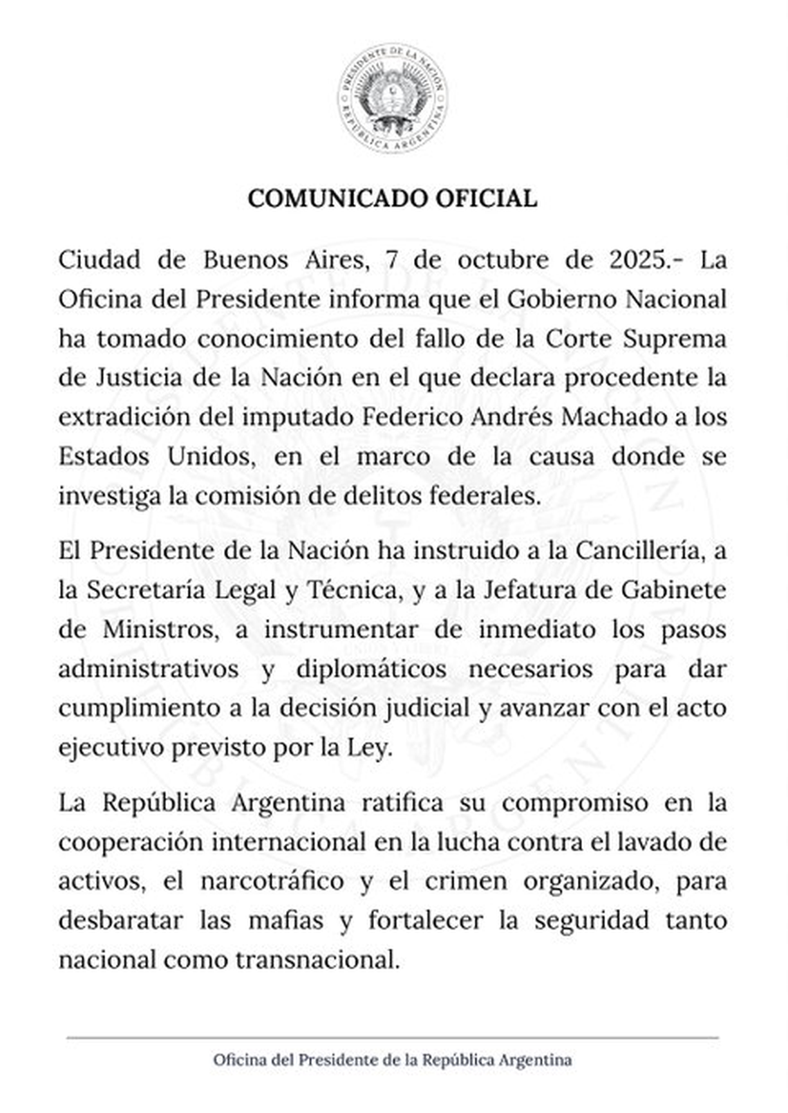 A través de un comunicado, la Oficina del Presidente informó que el jefe de Estado instruyó a la Cancillería, a la Secretaría Legal y Técnica y a la Jefatura de Gabinete a ejecutar de inmediato los pasos administrativos y diplomáticos necesarios para concretar la medida judicial conforme a lo previsto por la ley.