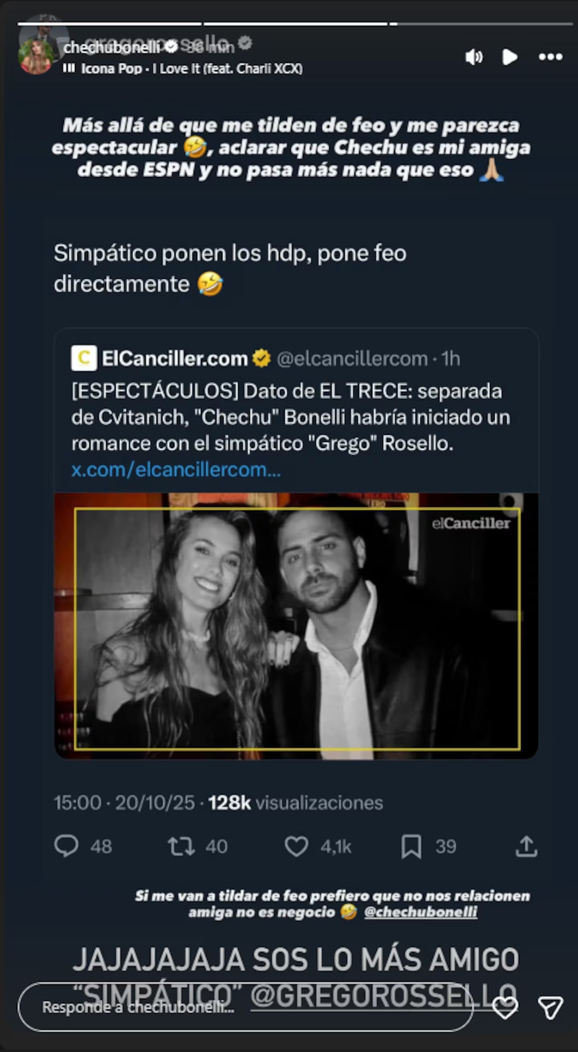 “Más allá de que me tilden de feo y me parezca espectacular, aclarar que Chechu es mi amiga desde ESPN y no pasa más nada que eso”, escribió. A puro humor, reclamó: “Simpático ponen los hdp, poné feo directamente”.