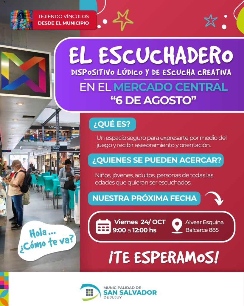 Este viernes 24 de octubre, el programa municipal, El Escuchadero llegará al Mercado Central 6 de Agosto, pensado para brindar contención, asesoramiento y orientación al público en general; niños, jóvenes adultos de todas las edades, que quieran ser escuchados. El espacio estará disponible de 9 a 12 horas para comenzar a tejer vínculos desde la propuesta municipal.