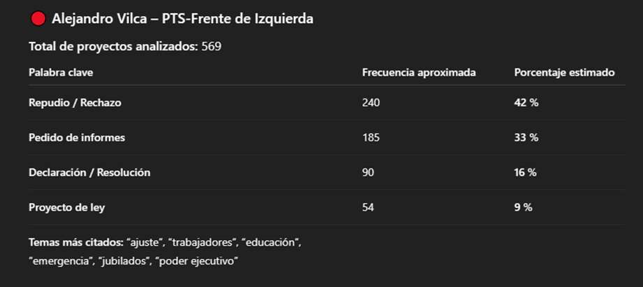 Alejandro Vilca, referente del Frente de Izquierda, acumula más de quinientos sesenta proyectos presentados en el Congreso. Sin embargo, la mayoría son resoluciones, pedidos de informes o declaraciones de repudio.