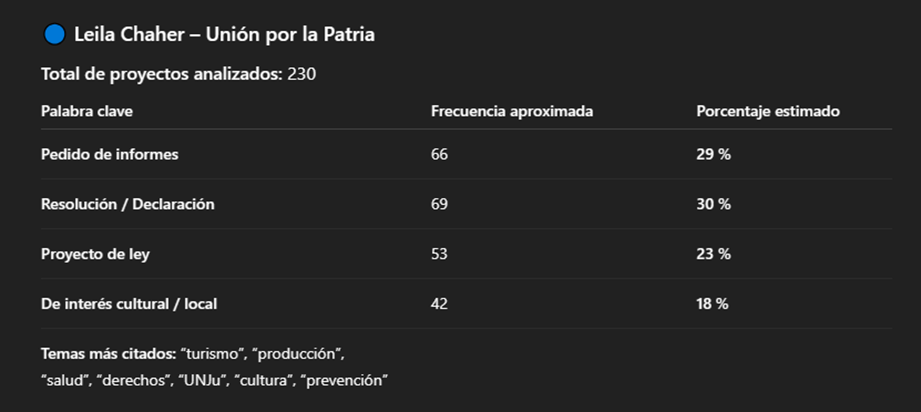 📊 Lectura: Tiene una producción más equilibrada, aunque la mayoría de sus proyectos no pasaron de comisión. Sus palabras reflejan un perfil institucional y de agenda regional (turismo, cultura, educación), pero con baja conversión a leyes efectivas.
