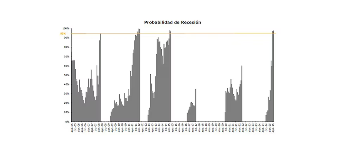La tabla clave del informe permite observar la evolución de la probabilidad de recesión para los meses previos. En mayo, la probabilidad se situó en 57,08%; en junio, en 56,16%. En julio se mantuvo en 56,16% y finalmente, en agosto, trepó a 98,61%. Es el registro más alto informado desde, al menos, 2018.
