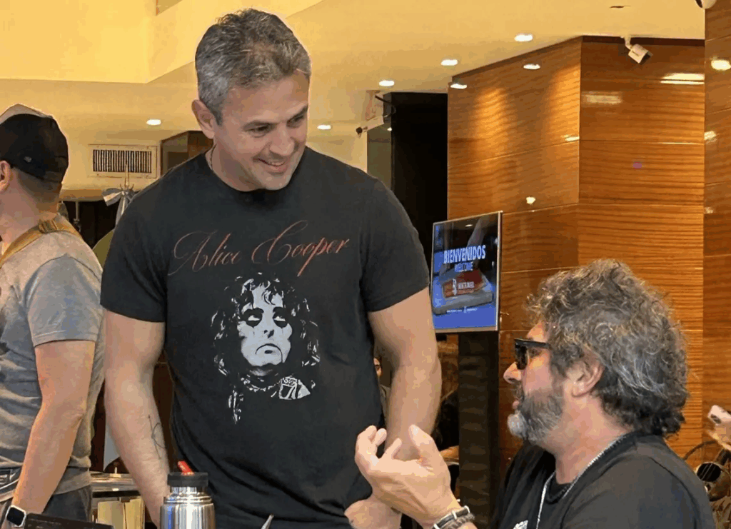 Menem, que se encontraba en la ciudad donde días atrás se hospedó el presidente Javier Milei para el cierre de campaña de La Libertad Avanza, lucía una remera de Alice Cooper, ícono del heavy metal.